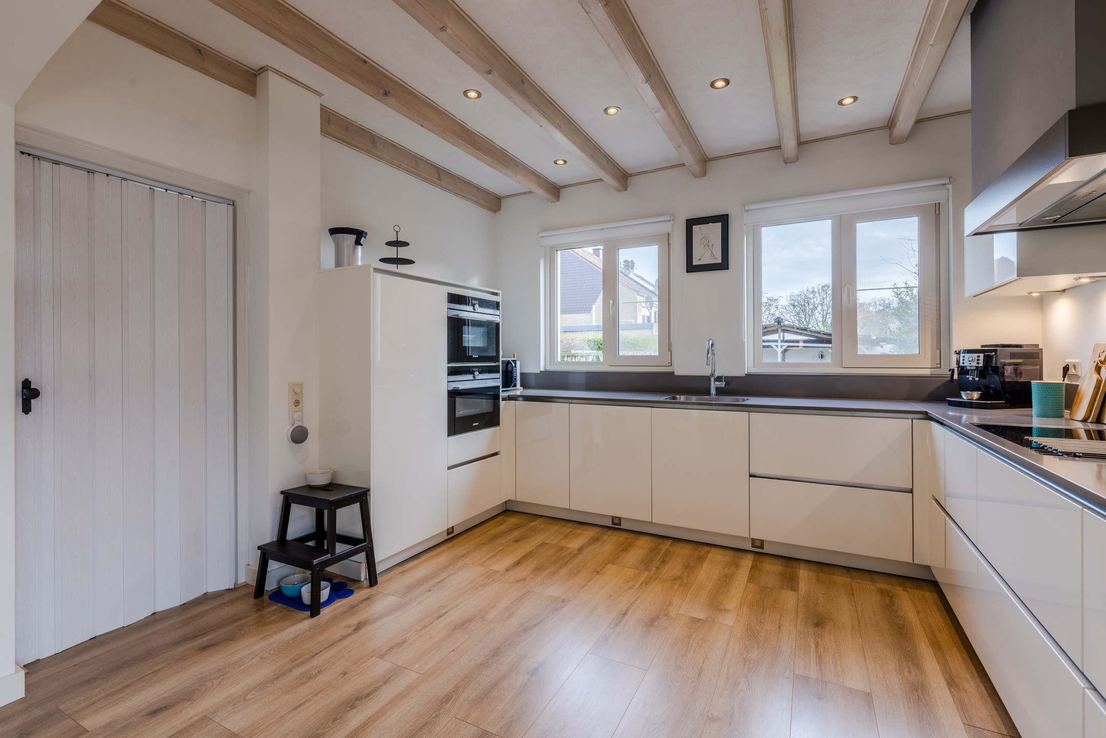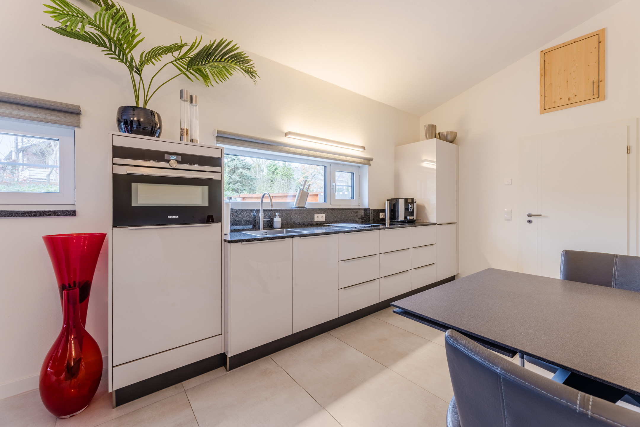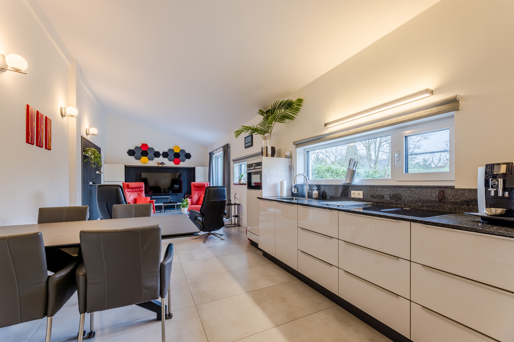 Aansluitend aan de hoofdwoning bevindt zich de volledig zelfstandige bungalow, met een eigen huisnummer en een moderne uitstraling. Deze bungalow beschikt over een royale woonkamer met openslaande deuren naar buiten en een strakke keuken met Siemens inbouwapparatuur, waaronder een inductiekookplaat met geïntegreerde afzuiging, koel-/vriescombinatie, cooker en een vaatwasser op hoogte.
