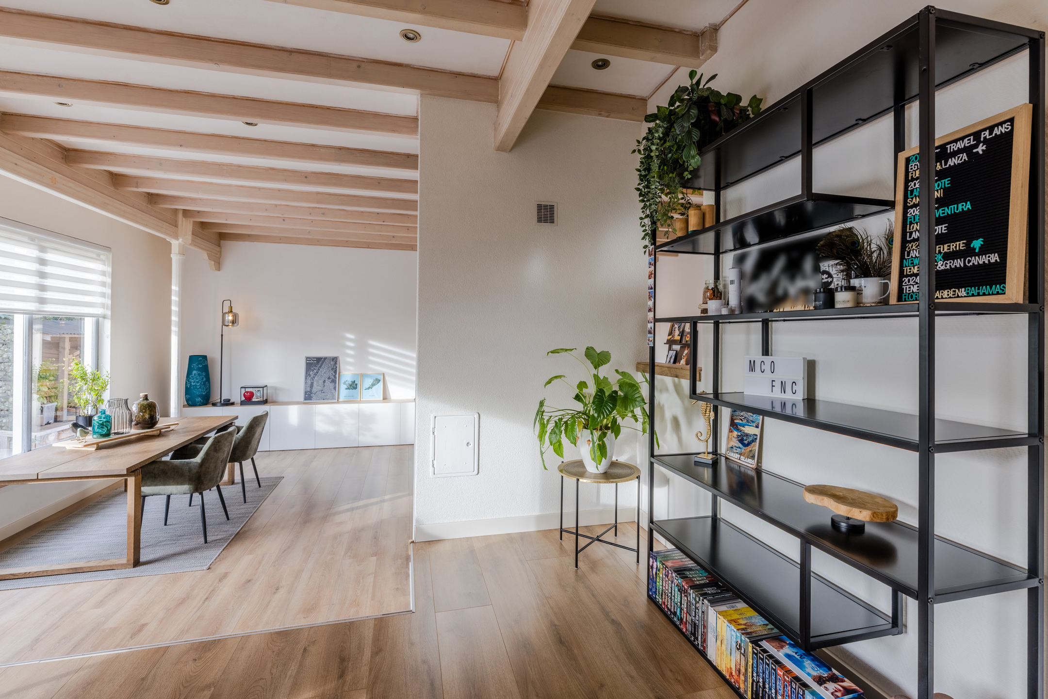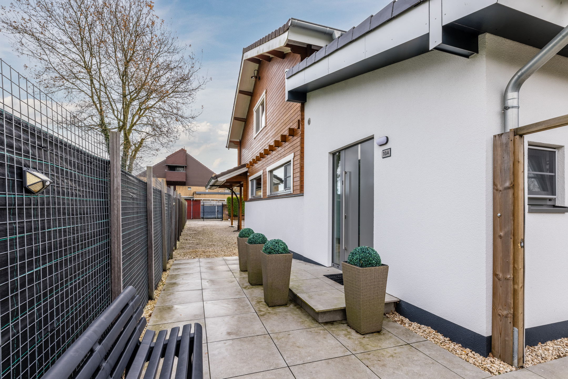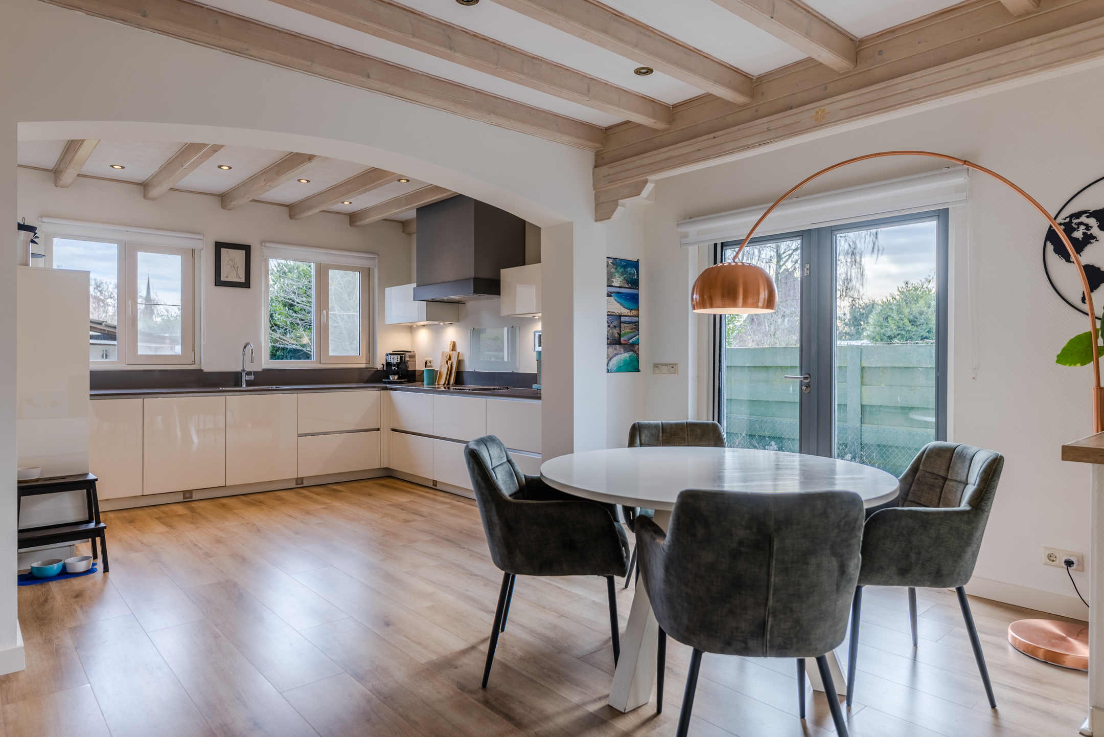 Aansluitend aan de hoofdwoning bevindt zich de volledig zelfstandige bungalow, met een eigen huisnummer en een moderne uitstraling. Deze bungalow beschikt over een royale woonkamer met openslaande deuren naar buiten en een strakke keuken met Siemens inbouwapparatuur, waaronder een inductiekookplaat met geïntegreerde afzuiging, koel-/vriescombinatie, cooker en een vaatwasser op hoogte.