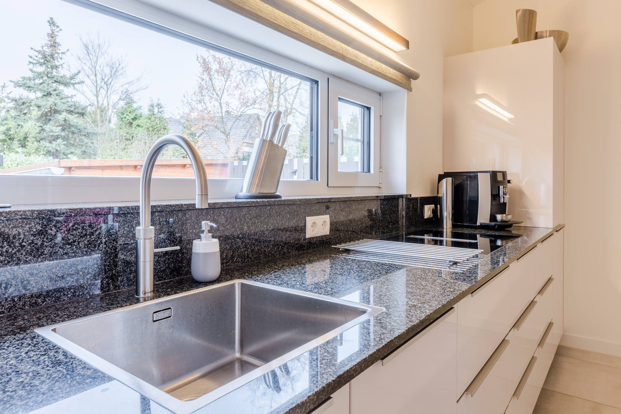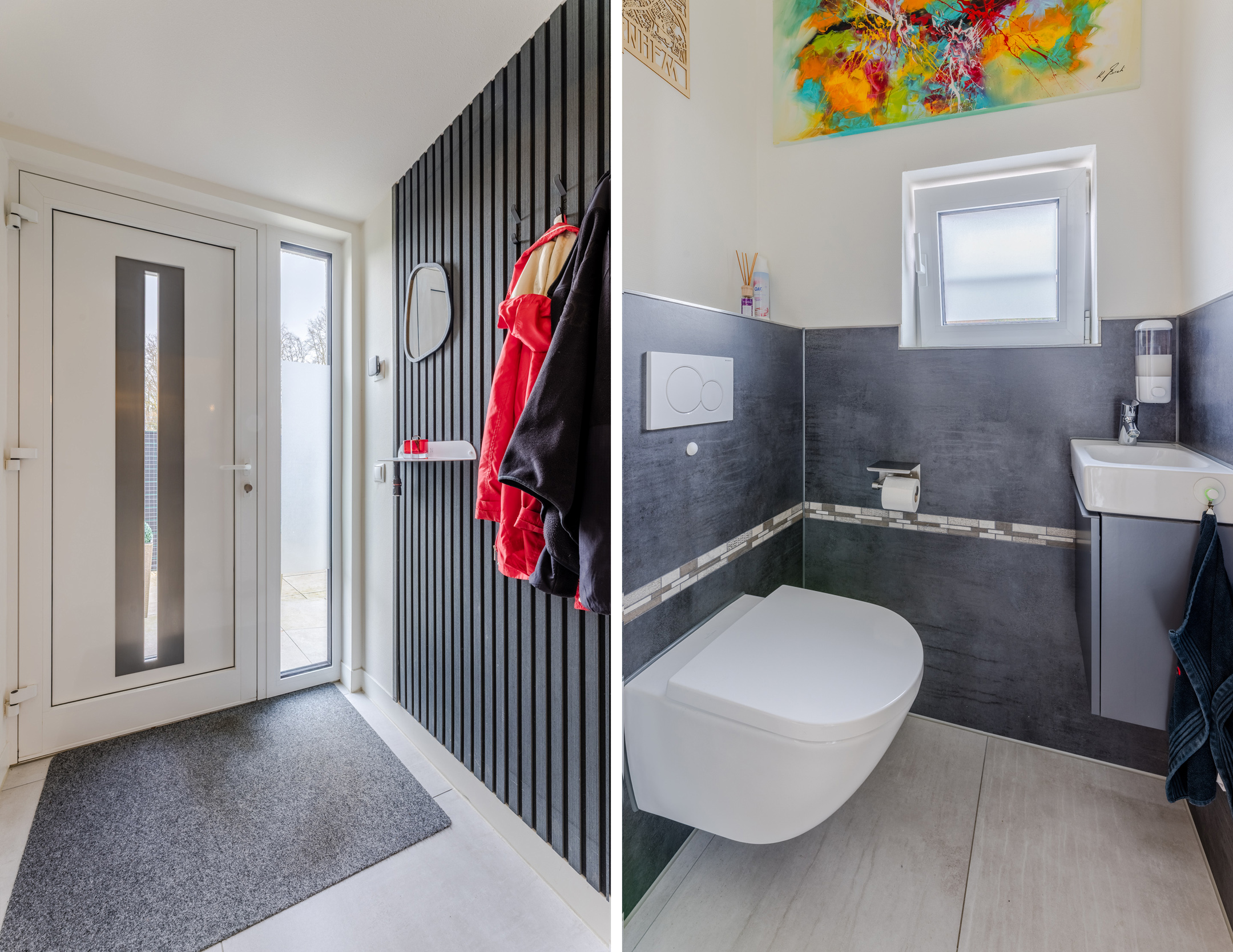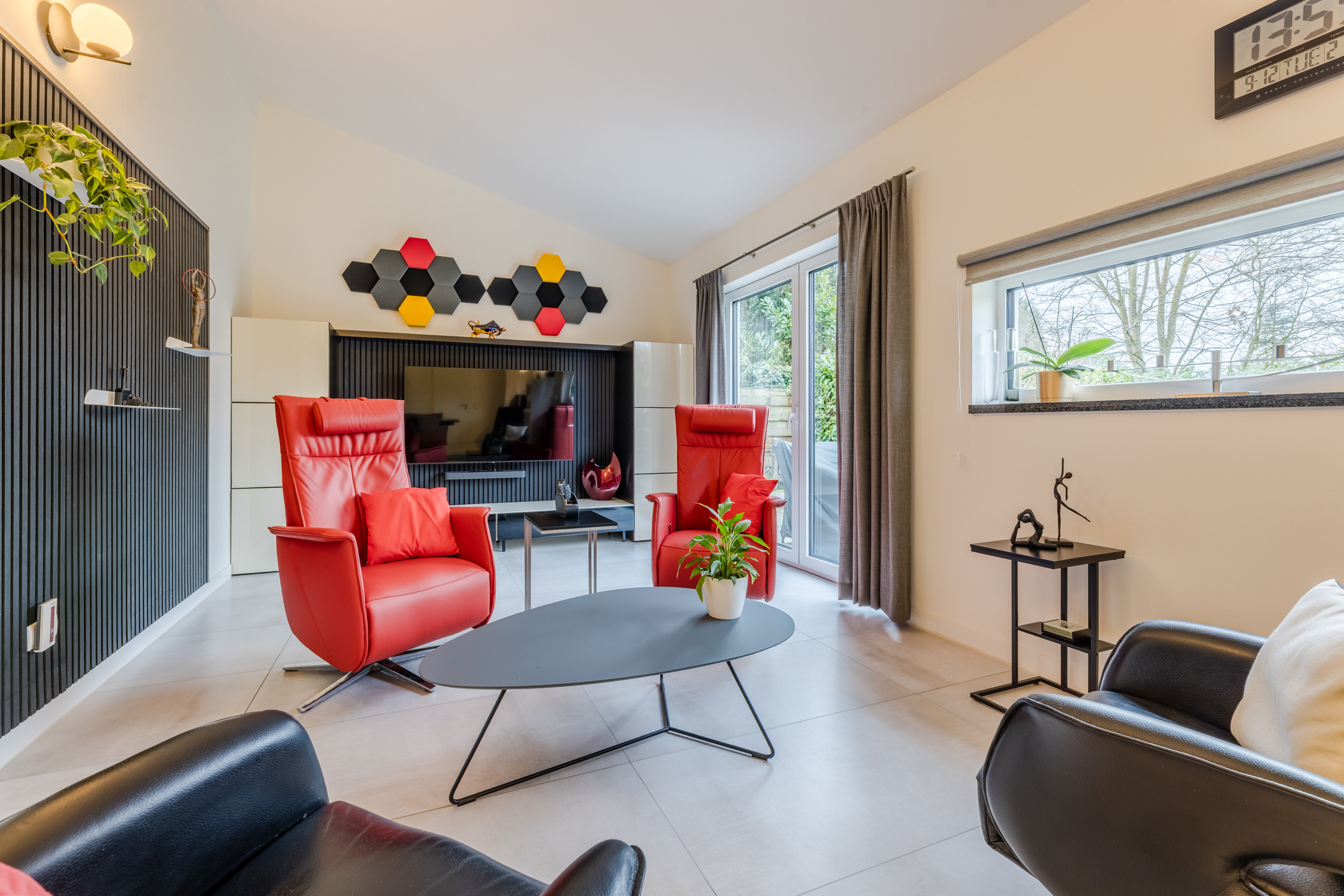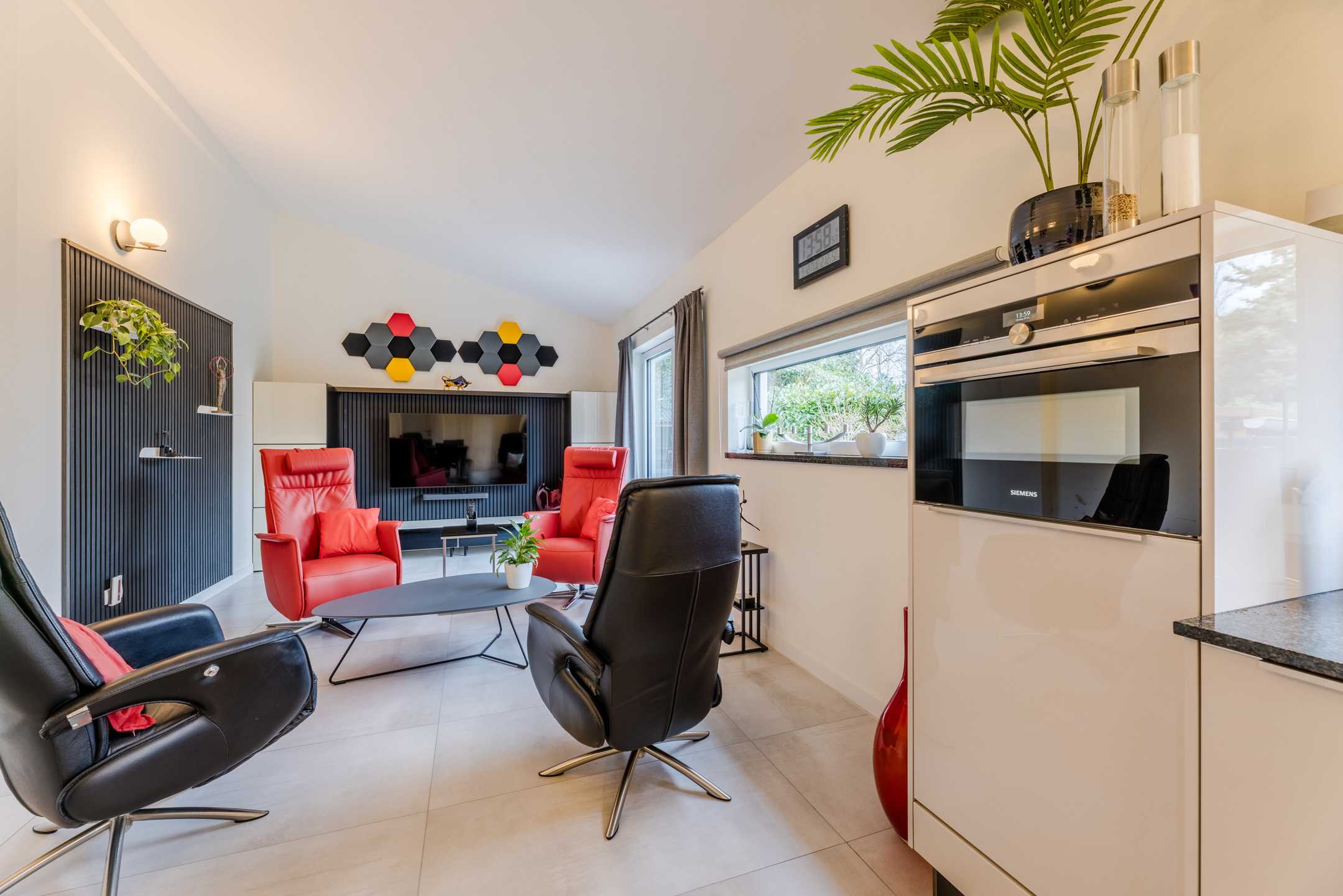 Aansluitend aan de hoofdwoning bevindt zich de volledig zelfstandige bungalow, met een eigen huisnummer en een moderne uitstraling. Deze bungalow beschikt over een royale woonkamer met openslaande deuren naar buiten en een strakke keuken met Siemens inbouwapparatuur, waaronder een inductiekookplaat met geïntegreerde afzuiging, koel-/vriescombinatie, cooker en een vaatwasser op hoogte.