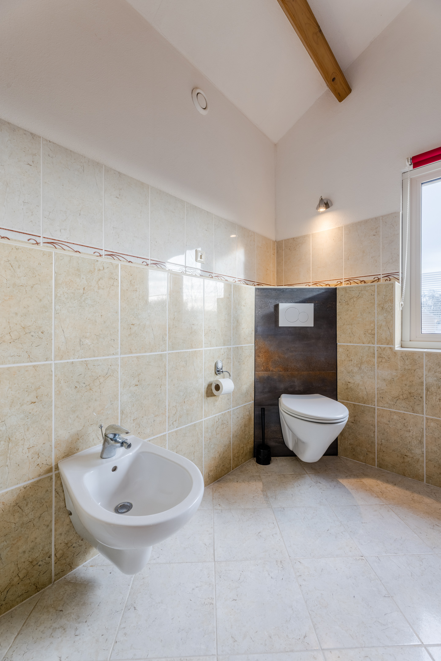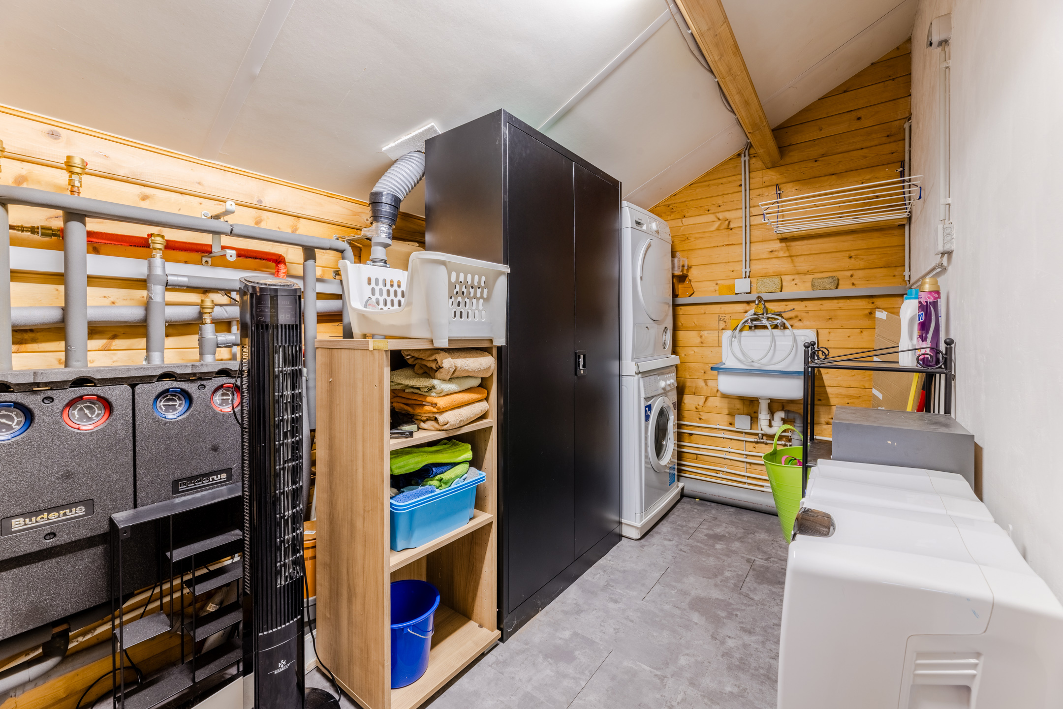 De bungalow telt twee slaapkamers, met een ensuite badkamer voorzien van douche en wastafel. Daarnaast is er een inpandige ruimte voor wasmachine en installaties. De gehele bungalow is uitgerust met vloerverwarming, welke naast verwarmen ook kan koelen, wat zorgt voor optimaal comfort in alle seizoenen.