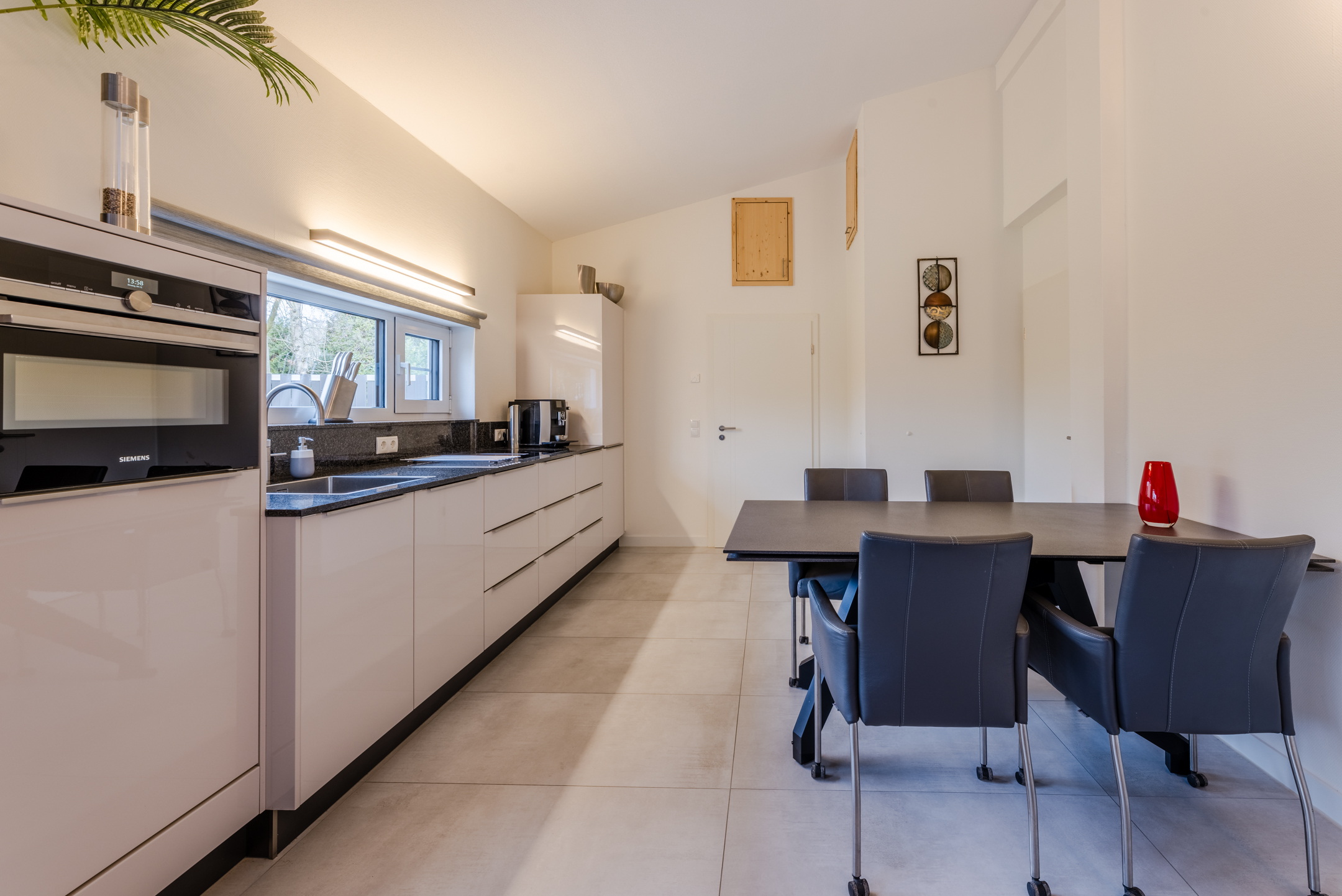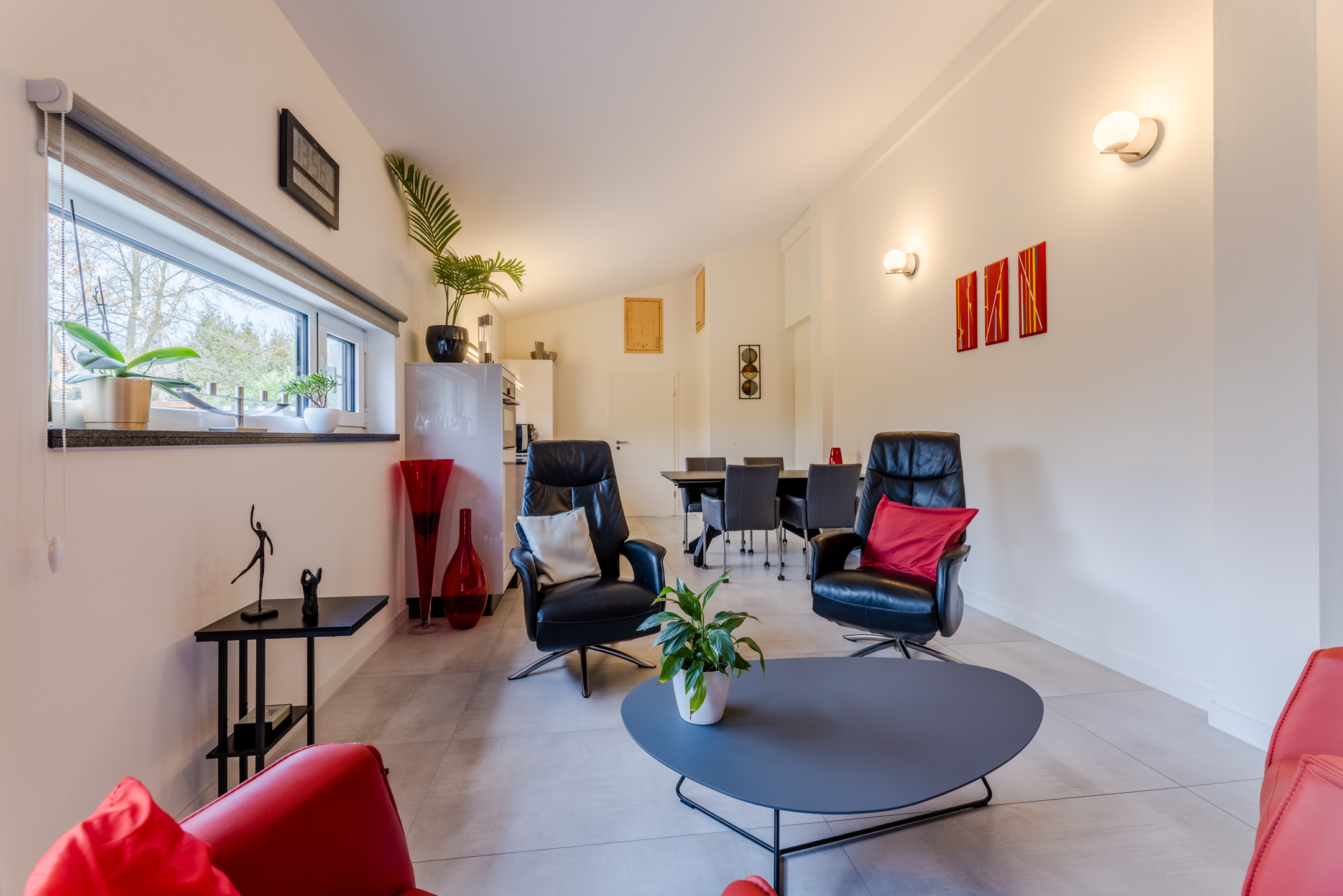 De hoofdwoning kenmerkt zich door een royale en sfeervolle indeling. De ruime woonkamer biedt een gezellige leefruimte met veel lichtinval. De moderne keuken is uitgevoerd met hoogwaardige Siematic inbouwapparatuur, waaronder een stoomoven, oven, grote koelkast en inductiekookplaat – een droom voor de kookliefhebber.